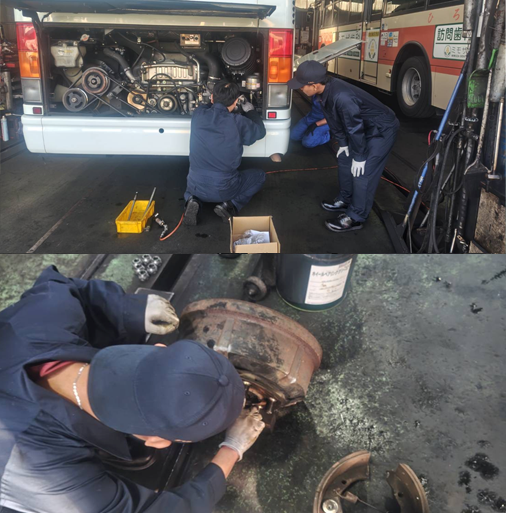 また新生サービスセンターでは、普段目にすることのないバスの点検整備の体験をしてもらっています。例えばタイヤの取り付け、ピットからの点検作業、さらには人気で恒例となっている荷台のペイント作業も思い出作りの意味で職場体験に盛り込んでいます。当然、生徒さんの安全確保、体調管理にも十分気を配り、水分補給、こまめな休憩をとりながら行っています。