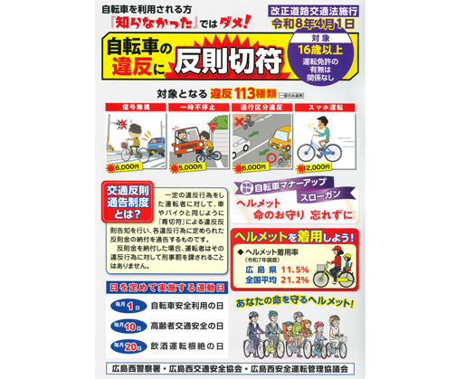 これにより、16歳以上の自転車利用者が信号無視や一時停止違反、スマートフォンの使用(ながら運転)などの交通違反を行った場合、反則金の対象となります。