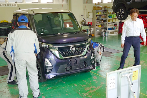 EV(電気自動車)や先進技術についての座学研修後、アリアのプロパイロットパーキング・ルークスのエーミング調整(※1)の実演などを行いましたが、多くの生徒さんが日産の先進技術に感動していました。